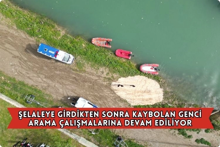 Çağlayan Mahallesi'nde 4 Nisan'da Tarsus Şelalesi'ne girdikten sonra akıntıya kapılarak kaybolan Kerem Batu Kaplan'ın (18) bulunması için ekipler çalışmalarına devam ediyor.