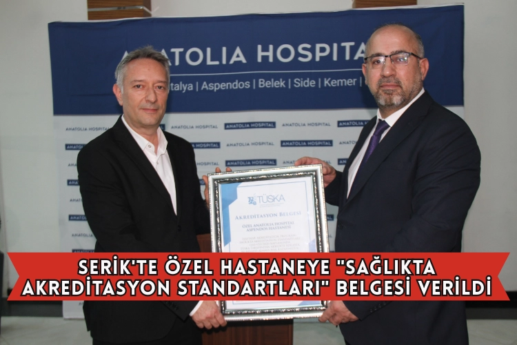 Törende, TÜSKA Başkanı Demir, "Sağlıkta Akreditasyon Standartları" belgesini Özel Anatolia Hospital Aspendos Hastanesi Müdürü Dinmezel'e teslim etti.