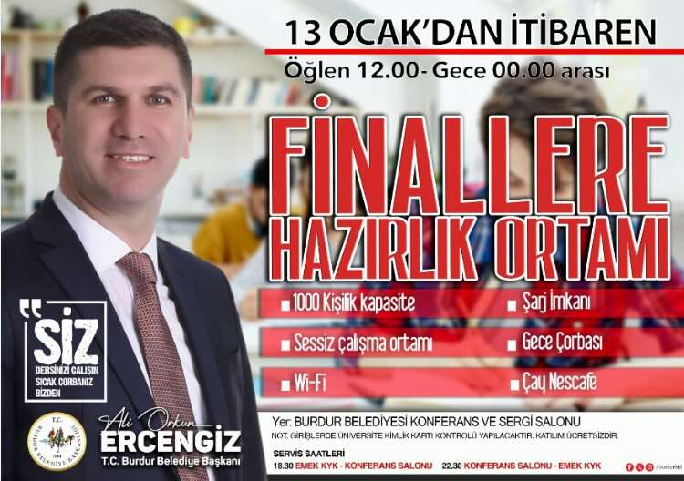 Başkan Ercengiz yaptığı açıklamada” Burdur Belediyesi olarak Üniversite öğrencilerimiz finallere hazırlanırken başarılı olabilmeleri için salonumuzun kapılarını öğrencilerimize açıyoruz. Öğrencilerimiz etüt merkezinden öğlen 12.00 ile gece 00.00 saatleri arasında faydalanabilirler. Burada öğrencilerimize gece çorbası, sıcak içecek ikramlarımız personelimiz tarafından yapılacak. Öğrencilerimiz aynı zamanda ücretsiz internet ve şarj imkânlarından da yararlanabilecek. Öğrencilerimizin isteklerini göz önünde bulundurarak sosyal belediyecilik anlayışımızı hizmetlerimizle sürdürüyoruz. Mehmet Akif Ersoy Üniversitemizde okuyan ve finallere girecek tüm öğrencilerimize başarılar dilerim” dedi.