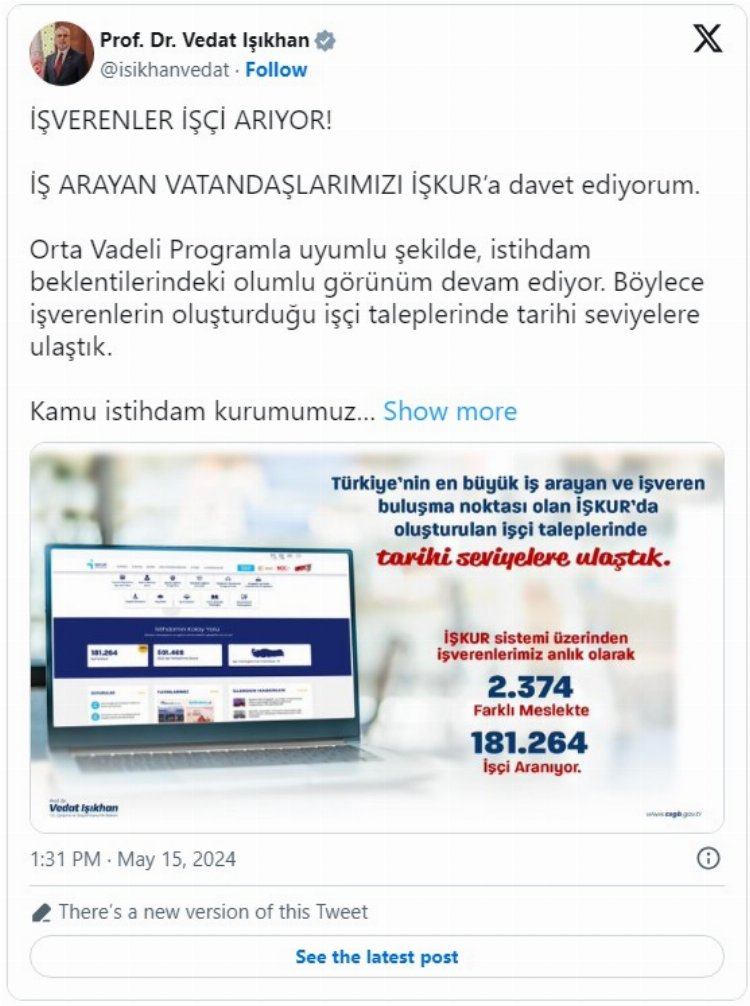 Bakan Işıkhan, sosyal medya hesabından yaptığı açıklamada, Orta Vadeli Program'la uyumlu şekilde istihdam beklentilerindeki olumlu görünümün devam ettiğini belirtti.