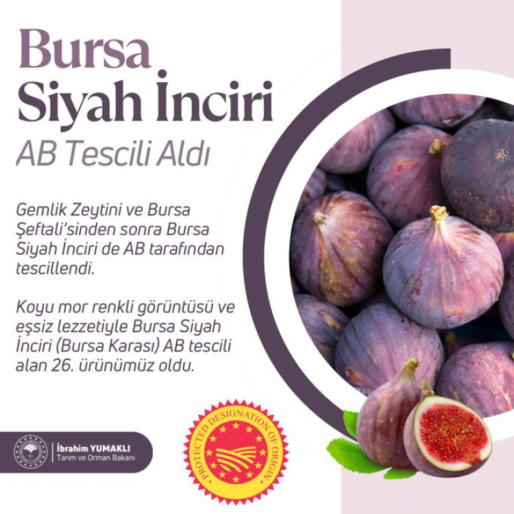 Tarım ve Orman Bakanı Yumaklı, Bursa siyah incirinin Türkiye adına Avrupa Birliği'nden (AB) tescil alan 26'ncı ürün olduğunu bildirdi.