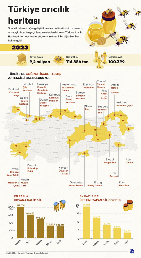 "Ülkemiz geneli ve illere göre ayrı ayrı hazırlanan haritamız, renk skalasıyla belirtilmiş üretici sayısı, kovan sayısı, bal üretimi ve kovan başı bal verimi gibi bilgiler içeriyor. Haritada ayrıca, ülkemiz genelinde üretimi yapılan bal çeşitleri ve bunların illere göre dağılımı, illerde en çok üretimi yapılan bal çeşitleri, tescil edilmiş coğrafi işaretli ballar, damızlık ana arı üreten iller ve kapasiteleri, damızlık ana arıların ırk özellikleri ve tescilleri, bombus arısı üreten iller ve kapasiteleri de yer alıyor."