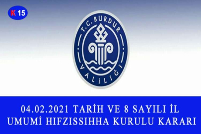 Umumi Hıfzıssıhha Kanunun 23. Maddesine göre, 04.02.2021 Perşembe günü saat 09.00’da Burdur Valisi Ali Arslantaş başkanlığında toplanan İl Umumi Hıfzıssıhha Kurulu tarafından aşağıdaki kararlar alınmıştır. "Bilindiği üzere Koronavirüs salgınının toplum sağlığı ve kamu düzeni açısından oluşturduğu riski yönetme, sosyal izolasyonu temin, fiziki mesafeyi koruma ve hastalığın yayılım hızını kontrol altında tutma amacıyla Sağlık Bakanlığı ve Koronavirüs Bilim Kurulunun önerileri, Sayın Cumhurbaşkanımızın talimatları doğrultusunda birçok tedbir kararı alınarak uygulamaya geçirilmektedir. Koronavirüs salgınıyla mücadele kapsamında 01.02.2021 tarihinde Sayın Cumhurbaşkanımızın başkanlığında toplanan Cumhurbaşkanlığı Kabinesinde alınan kararlar doğrultusunda yüz yüze örgün eğitime kademeli olarak başlanması kararlaştırılmıştır. Bu kapsamda hafta sonları için getirilen sokağa çıkma kısıtlaması süresince gün içerisinde çalışabilecek iş yerlerine ilişkin düzenlemelere ve sokağa çıkma kısıtlamasından muaf tutulan kişiler ile iş yerlerine yer verilmiştir. Sokağa çıkma kısıtlamasının uygulandığı günlerde çiçek satışı yapan işletmelerin faaliyetlerini evlere servis şeklinde 10.00-17.00 saatleri arasında sürdürebileceği belirtilmiştir. Bu kapsamda Umumi Hıfzıssıhha Kanununun 27nci ve 72nci maddeleri uyarınca;