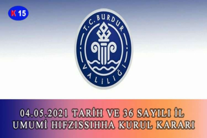 Umumi Hıfzıssıhha Kanunun 23. Maddesine göre, 04.05.2021 Salı günü saat 10.00’da Burdur Valisi Ali Arslantaş başkanlığında toplanan İl Umumi Hıfzıssıhha Kurulu tarafından alınan kararlar şu şekilde;