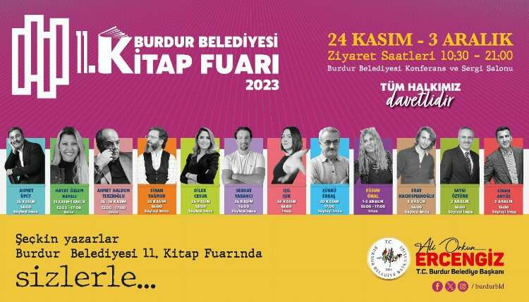 Kitap fuarıyla ilgili açıklama yapan Burdur Belediye Başkanı Ali Orkun Ercengiz; “Bu yıl 11. sini gerçekleştireceğimiz kitap fuarımızda geçtiğimiz senelerde olduğu gibi yine gençlerimizi, çocuklarımızı, okumayı seven tüm vatandaşlarımızı kitapla buluşturacağız. Tüm hemşerilerimizi fuarımıza, kitapla ve yazarlarımızla buluşmaya davet ediyorum” dedi. 7’den 70’e tün kitapseverlere hitap edecek olan fuarda bu yıl aralarında Ahmet Ümit, Hayat Özlem Kayalı, Ahmet Haldun Terzioğlu, Sinan Yağmur, Dilek Cesur, Serhat Yabancı, Işıl Işık, Şükrü Erbaş, Füsun Önal, Eray Hacıosmanoğlu, Saygı Öztürk, Sinan Akyüz gibi isimlerin olduğu birbirinden değerli yazarlar, imza günlerine katılacak. 24 Kasım Cuma günü açılışı yapılacak olan 11. Kitap Fuarı 3 Aralık Pazar gününe kadar 10.30-21:00 saatleri arasında ziyarete açık olacak.