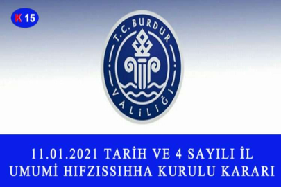 Umumi Hıfzıssıhha Kanunun 23. Maddesine göre, 11.01.2021 Pazartesi günü Burdur Valisi Ali Arslantaş başkanlığında toplanan İl Umumi Hıfzıssıhha Kurulu tarafından aşağıdaki kararlar alınmıştır. Alınan kararlar şöyle; “Bilindiği üzere Koronavirüs salgınının toplum sağlığı ve kamu düzeni açısından oluşturduğu riski yönetme, sosyal izolasyonu temin, fiziki mesafeyi koruma ve hastalığın yayılım hızını kontrol altında tutma amacıyla Sağlık Bakanlığı ve Koronavirüs Bilim Kurulunun önerileri, Sayın Cumhurbaşkanımızın talimatları doğrultusunda birçok tedbir kararı alınarak uygulamaya geçirilmektedir. 01.12.2020 tarih ve 131 sayılı İl Umumi Hıfzıssıhha Kurulu Kararı ile Cuma günleri saat 21.00’da başlayıp Cumartesi ve Pazar günlerinin tamamını kapsayacak ve pazartesi günleri saat 05.00’da sona erecek şekilde sokağa çıkma kısıtlaması getirilmesi nedeniyle Aydınlıkevler ve Armağan İlci Mahallesinde Pazar günleri kurulmakta olan semt pazarlarının Cuma günleri aynı yerde kurulmasına, sağlanmasına (maske, mesafe, HES kodu sorgulama gibi), denetimlerin kolluk kuvvetleri ve pazar yeri yöneticisince yapılmasına; Hafta içi kurulan hayvan, oto pazarları ve tüm semt pazarlarında vatandaşların HES kodunun zabıta ve polis tarafından kontrol edilmesine, Konu hakkında gerekli hassasiyetin gösterilerek uygulamanın yukarıda belirtilen çerçevede eksiksiz bir şekilde yerine getirilmesinin sağlanmasına, tedbirlere uymayanlarla ilgili Umumi Hıfzıssıhha Kanununun 282nci maddesi gereğince idari para cezası verilmesine, aykırılığın durumuna göre Kanunun ilgili maddeleri gereğince işlem yapılmasına, konusu suç teşkil eden davranışlara ilişkin Türk Ceza Kanununun 195 inci maddesi kapsamında gerekli adli işlemlerin başlatılmasına; Oy birliğiyle karar verilmiştir. Kamuoyuna saygıyla duyurulur”
