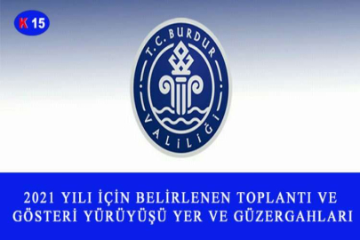 Burdur merkezde 2021 yılında yapılacak olan toplantı ve gösteri yürüyüşü yer ve güzergahları ile çağrı ve propaganda araçlarının asılması gereken yerler belirlendi. Konu hakkında Burdur Valiliğinden açıklama yapıldı. Valilikten yapılan açıklama şu şekilde; "2911 Sayılı Toplantı ve Gösteri Yürüyüşleri Kanunu ve Uygulanmasına Dair Yönetmeliğin ilgili hükümleri gereğince, 2021 yılında yapılacak olan toplantı ve gösteri yürüyüşü yer ve güzergahları ile çağrı ve propaganda araçlarının asılması gereken yerler Valilik Makamının 22.01.2021 tarihli ve 619 sayılı onayı ile aşağıda belirtilen şekilde belirlenmiştir.