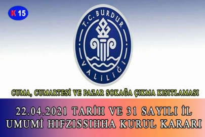 Umumi Hıfzıssıhha Kanunun 23. Maddesine göre, 22.04.2021 Perşembe günü saat 09.00’da Burdur Valisi Ali Arslantaş başkanlığında toplanan İl Umumi Hıfzıssıhha Kurulu tarafından bir takım kararlar alındı. Alınan kararlar şöyle; "Bilindiği üzere Koronavirüs salgınının toplum sağlığı ve kamu düzeni açısından oluşturduğu riski yönetme, sosyal izolasyonu temin, fiziki mesafeyi koruma ve hastalığın yayılım hızını kontrol altında tutma amacıyla Sağlık Bakanlığı ve Koronavirüs Bilim Kurulunun önerileri, Sayın Cumhurbaşkanımızın talimatları doğrultusunda birçok tedbir kararı alınarak uygulamaya geçirilmektedir.