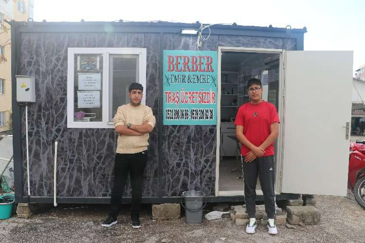 İki kardeş, berber dükkanına dönüştürdükleri konteynerde depremzedelere destek için 7 aydır ücretsiz tıraş hizmeti sunuyor.
