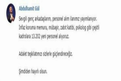 Adalet Bakanı Abdülhamit Gül, infaz koruma memuru, mübaşir, zabıt katibi, psikolog gibi çeşitli kadrolara 13 bin 202 yeni personel alınacağını telegram'dan duyurdu. Bakan Gül telegram'dan yaptığı açıklama şöyle; "Sevgili genç arkadaşlarım, personel alım ilanımız yayımlanıyor. İnfaz koruma memuru, mübaşir, zabıt katibi, psikolog gibi çeşitli kadrolara 13 bin 202 yeni personel alıyoruz. Adalet teşkilatımızı sizlerle güçlendireceğiz. Şimdiden hayırlı olsun."