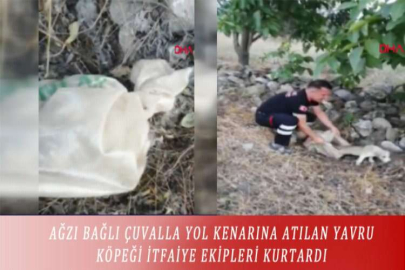AĞZI BAĞLI ÇUVALLA YOL KENARINA ATILAN YAVRU KÖPEĞİ İTFAİYE EKİPLERİ KURTARDI