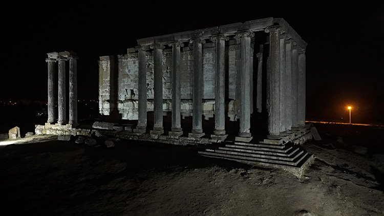 Antik kentteki Zeus Tapınağı'nın gün batımı ve akşamın ilk saatlerindeki ışıklandırılmış manzaraları AA ekibince dronla görüntülendi.
