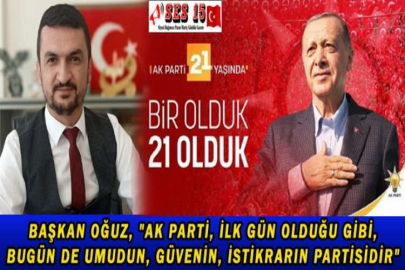 Başkan Oğuz mesajında şu ifadeleri kullandı: "Bugün, Liderimiz Recep Tayyip Erdoğan öncülüğünde “Aydınlığa açık, Karanlığa kapalı” şiarıyla yola çıkan AK Parti’mizin kuruluşunun 21. yıldönümüdür. AK Parti, bir medeniyet mücadelesidir, adalet ve kalkınma mücadelesidir.