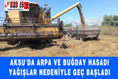 Antalya ve çevre ilçelerindeki yağışlar, geçen yıla göre arpa ve buğday hasadının gecikmesine neden oldu. Yaklaşık 15 bin dekarlık alanda buğday ve arpa dikimi yapılan Aksu ilçesinde ,yağışların ardından arpa ve buğday hasadına başlandı. Hasadın haziran ayının sonuna kadar sürmesi bekleniyor.