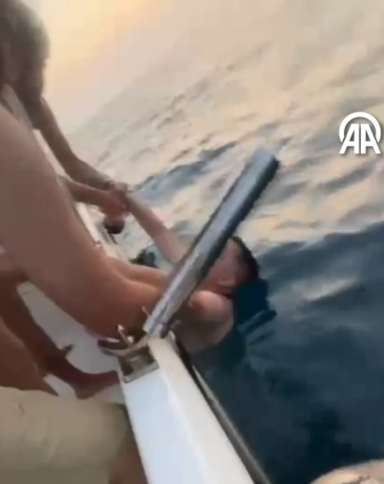 Öte yandan turistin kurtarılma anı balıkçılar tarafından cep telefonu kamerasıyla kaydedildi. Görüntüde turistin boğulma tehlikesi geçirmesi ve tekneye çıkarılması yer alıyor.