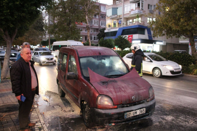 Hacet Mahallesi Şevket Tokuş Caddesi'nde belirlenemeyen nedenle yanmaya başlayan seyir halindeki hafif ticari aracın sürücüsü, durumu fark ederek aracı durdurdu.
