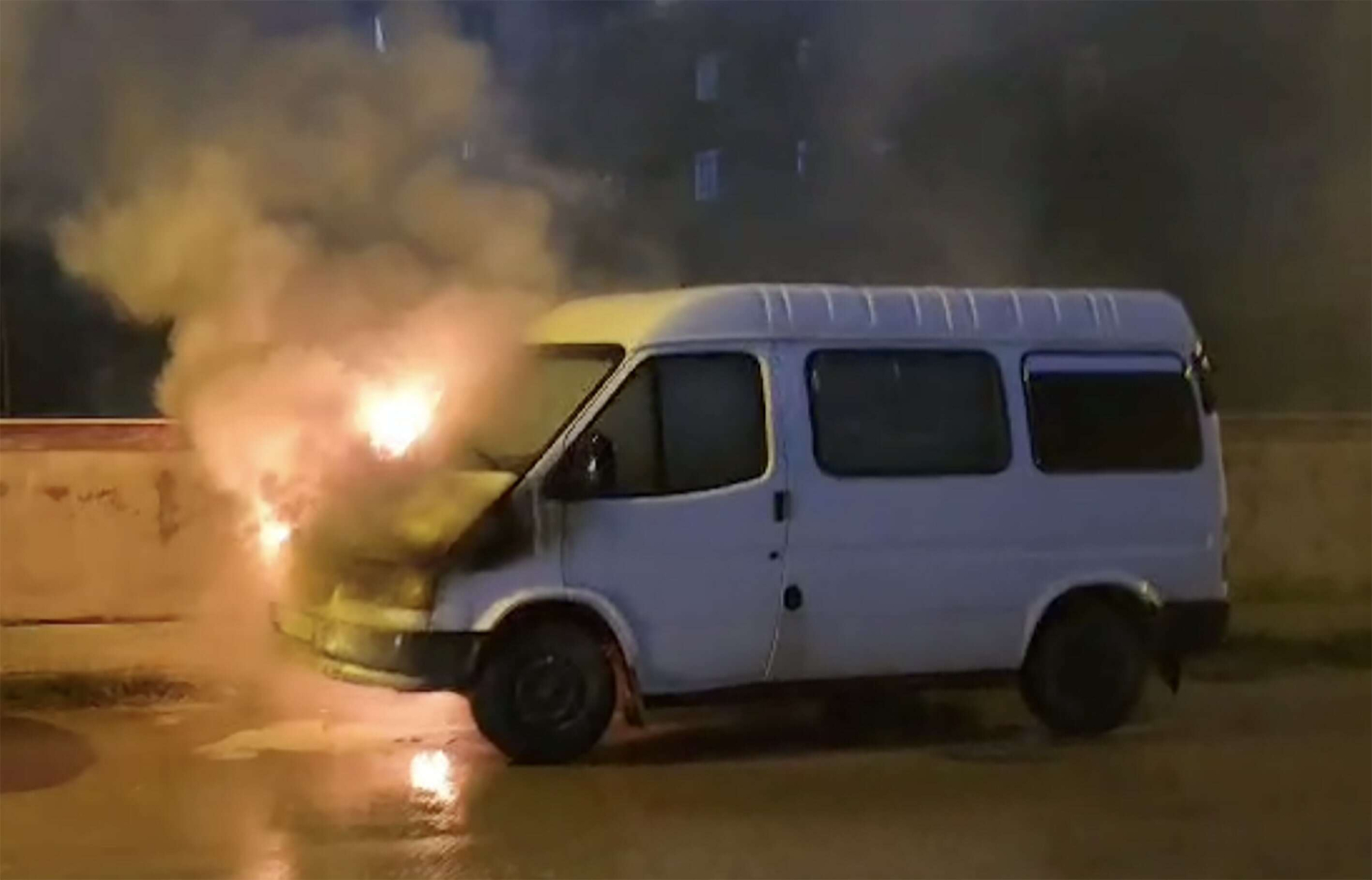 Tosmur Mahallesi Okul Caddesi'nde seyir halinde olan bir minibüs, belirlenemeyen nedenle alev aldı.