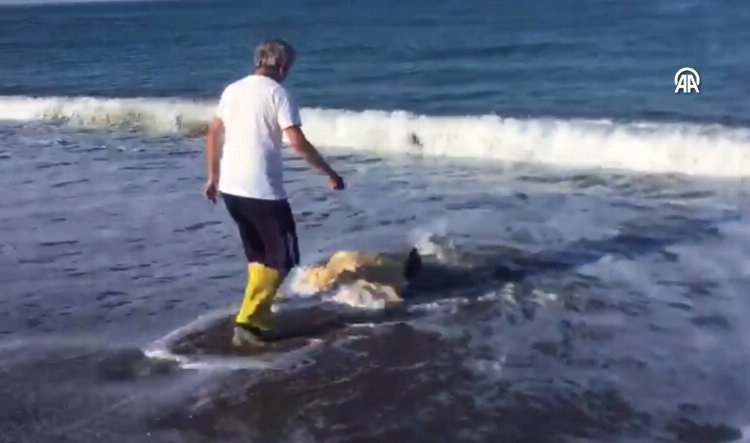 Yeşilöz Mahallesi sahilinde yürüyüş yapan Güldane ve Menderes Şahin çifti, bölgeye yuva yaptıktan sonra ters dönen deniz kaplumbağasını fark etti.