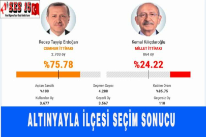 Altınyayla: Recep Tayyip Erdoğan: % 75. 78- 2 bin703 oy. Kemal Kılıçdaroğlu: % 24. 22- 864 oy.