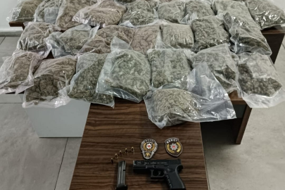 Zanlıların üzerinde ve ellerindeki valizlerde, 1 ruhsatsız tabanca, tabancaya ait şarjöre basılı 5 fişek ve 32 ayrı paket halinde 17 kilogram esrar bulundu.