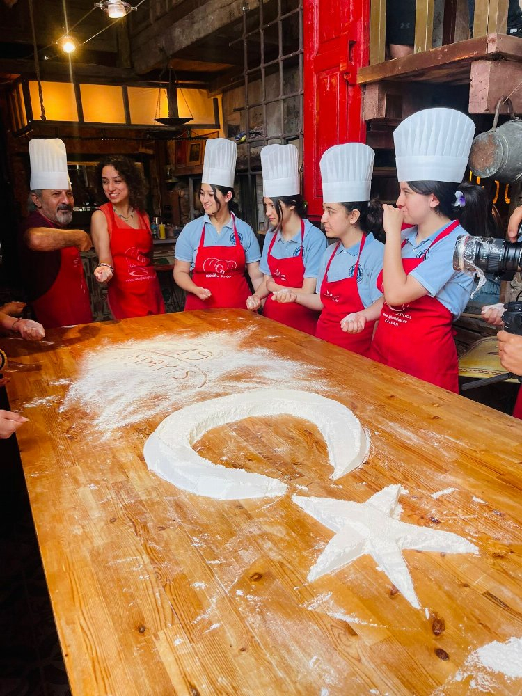 Antalya'nın Kaş ilçesinde, aşçılık okuluna dönüştürülen tarihi binada 19 Mayıs Atatürk'ü Anma, Gençlik ve Spor Bayramı kapsamında 19 metrelik erişte hamuru açıldı.