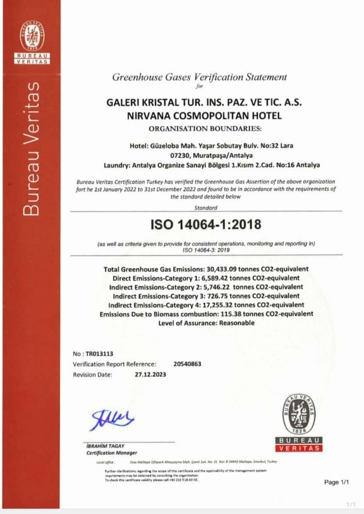 Nirvana Cosmopolitan Hotel'in, ISO 14064-1: 2018 standardına ulaşarak, Antalya'da bu alanda ilk ve tek tesis olduğu aktarıldı.