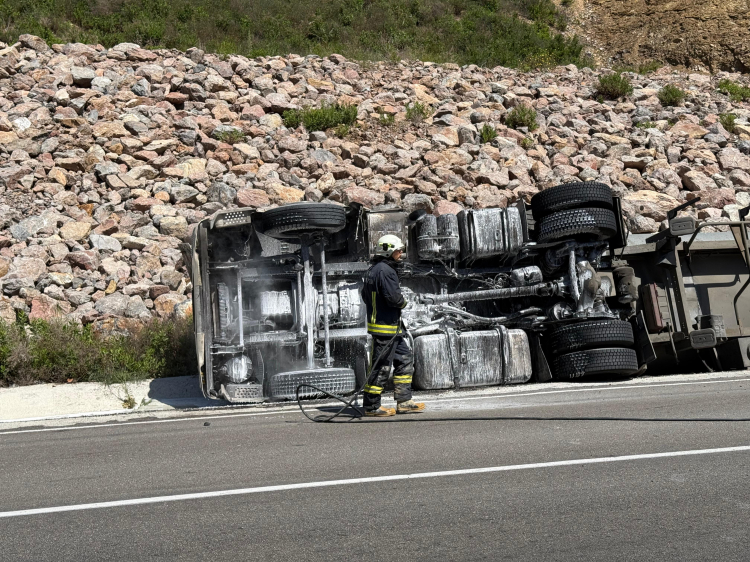 Devrilen tırda daha sonra yangın çıktı.
