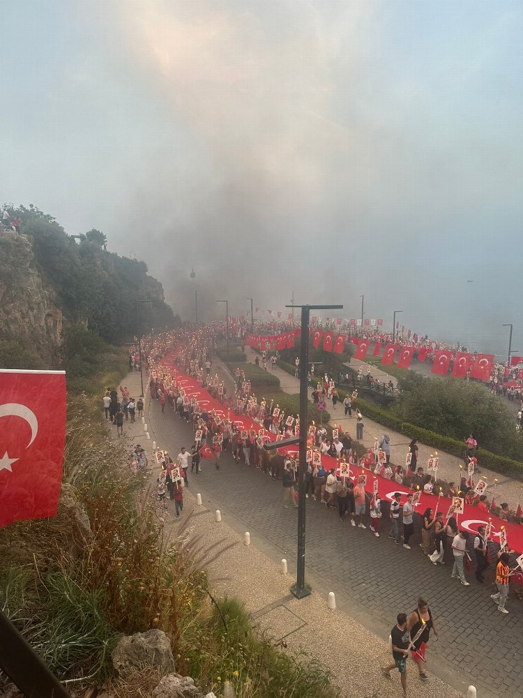 Büyükşehir Belediyesi tarafından Konyaaltı Caddesi'ndeki Varyant'ta düzenlenen fener alayı için Türk bayrağı, dövizler ve Gazi Mustafa Kemal Atatürk'ün fotoğraflarını taşıyan binlerce kişi, Konyaaltı Beach Park girişinde bir araya geldi.