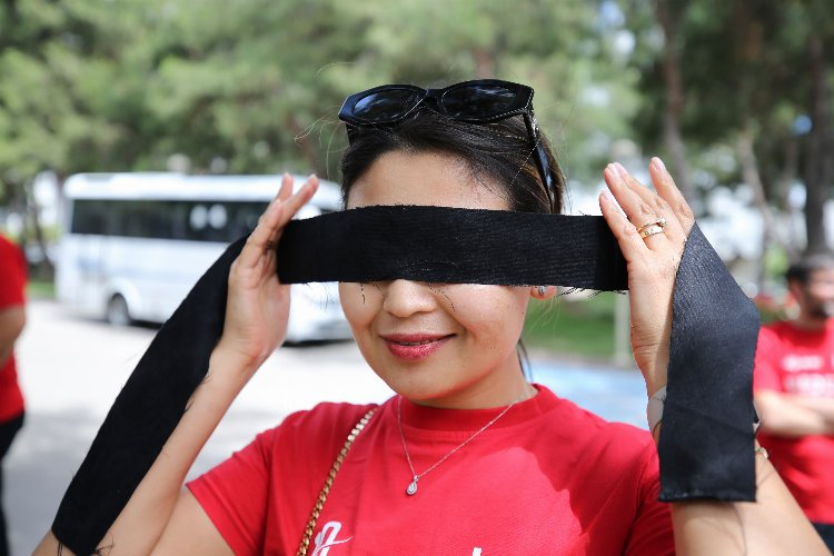 Farkındalık oluşturmak ve görme engelli bireylerin sorunlarına dikkati çekmek amacıyla düzenlenen etkinlikte siyah göz bandı takan katılımcılar, görme engelli vatandaşlarla park içinde yürüdü.