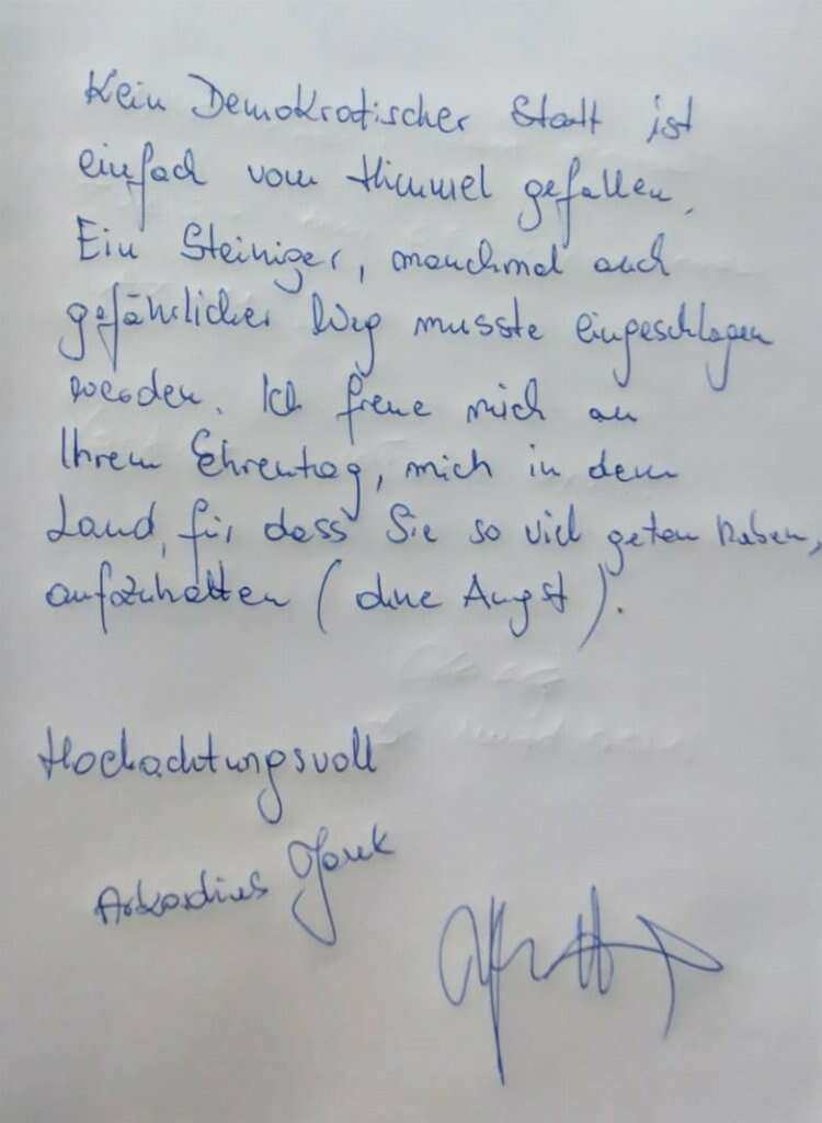 Tauk notunda, "Özel gününüzde uğruna bu kadar çok şey yaptığınız bir ülkede olmaktan mutluyum. Korkmadan." ifadelerini kullandı.