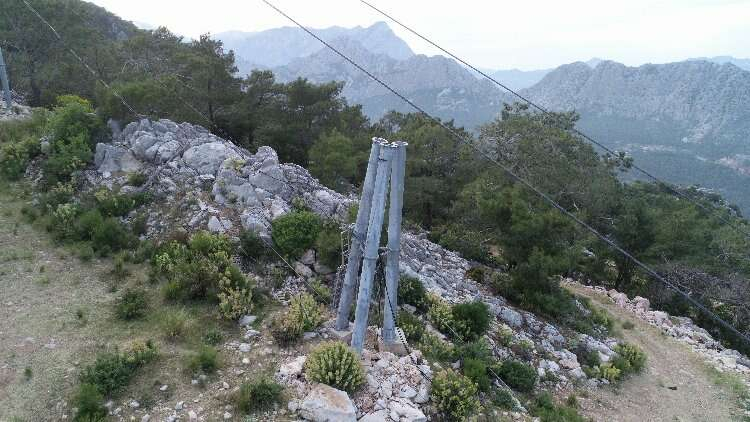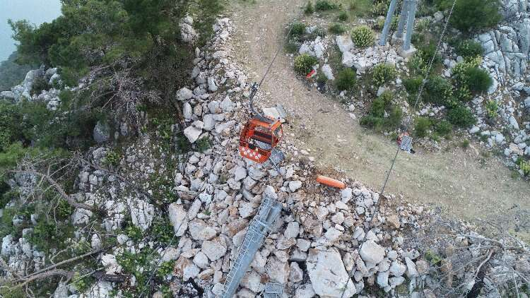 Teleferik sistemindeki direklerden birinin devrilmesinin yol açtığı kaza bölgesi havadan görüntülendi.