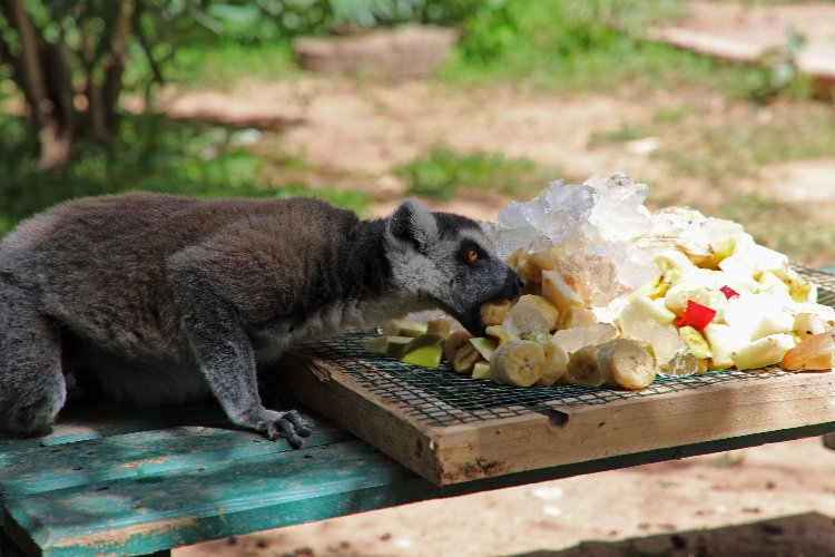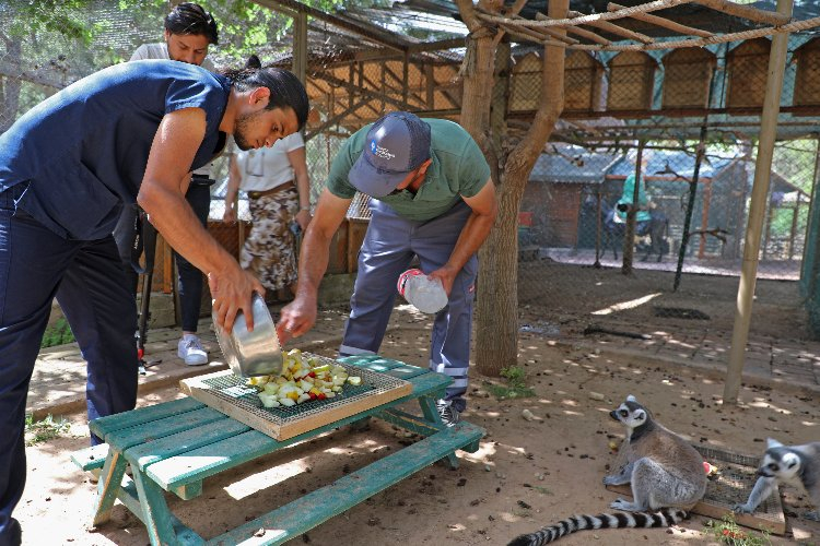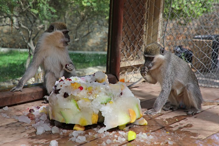 Doğal yaşam parkı sakinlerinden bozayı, lemur ve maymunların karpuz, portakal, kiraz, muz, elma gibi meyvelerden oluşan buzlu kokteyli yediği anlar, ziyaretçilerin ilgisini çekiyor.
