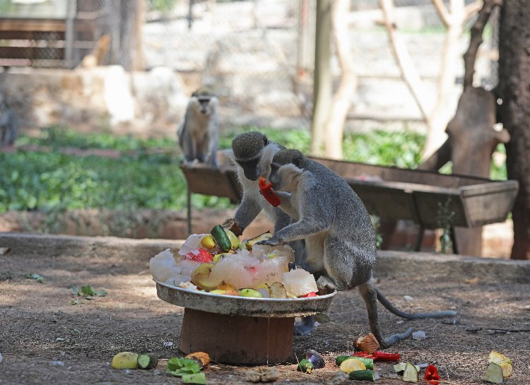 Parkın çalışanları, 1400'ün üzerindeki hayvanın kentte etkili olan bunaltıcı sıcaklardan olumsuz etkilenmemesi için çaba sarfediyor. Görevliler sıcaktan bunalan hayvanları, özel hazırlanmış buz kalıpları içinde meyve ve sebze kokteyliyle besliyor.