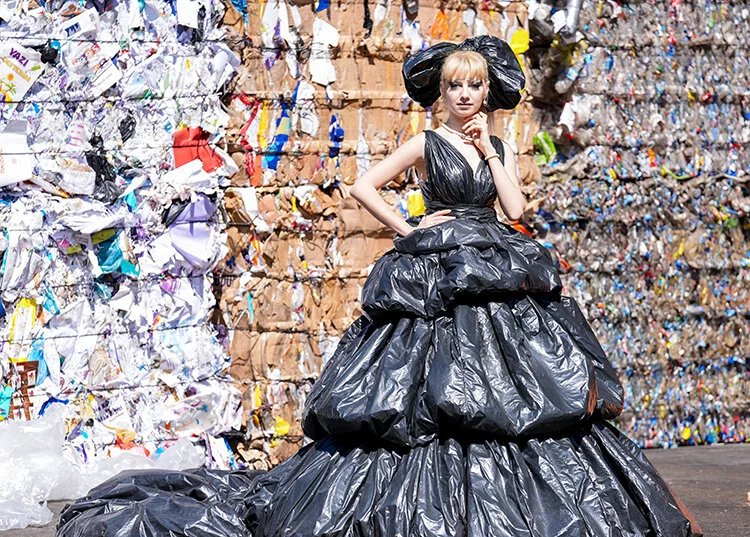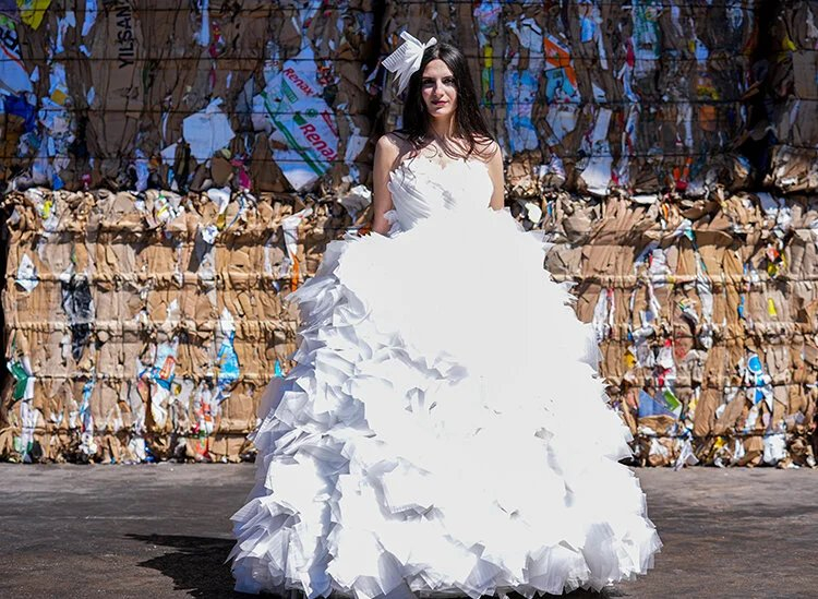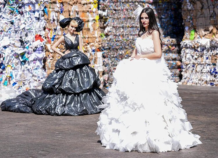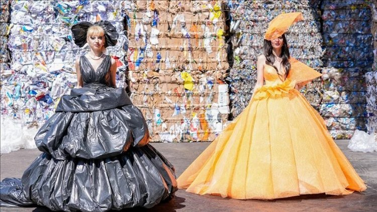 Kentteki bir geri dönüşüm tesisinde, depolanan atıklar arasında düzenlenen defilede mankenler, atık ürünlerle hazırlanan gelinlik ve rengarenk kıyafetleri giydi.