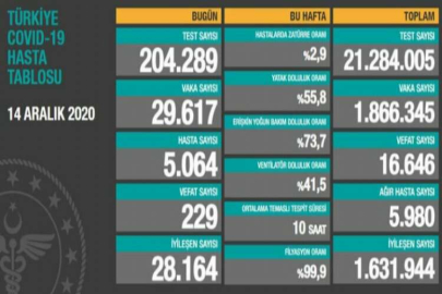 Sağlık Bakanı Fahrettin Koca 14 Aralık tarihli korona tablosunu kamuoyuyla paylaştı. Türkiye’de son 24 saatte 5.064 kişiye Covid-19 tanısı konuldu, 229 kişi hayatını kaybetti. Sağlık Bakanı Fahrettin Koca Koronavirüsün Türkiye’deki son durum bilgilerini günlük açıklıyor. Bakan Fahrettin Koca, 14 Aralık Pazartesi gününe ilişkin son durum bilgilerini paylaştı. Sağlık Bakanı Fahrettin Koca rakam ve istatistiki verileri paylaştığı açıklamasında; “Türkiye Günlük Koronavirüs Tablosu güncel verilerine göre, bugün 204 bin 289 test yapıldı. 26.617 pozitif vaka 5.064 kişi de hastane de tedavi görüyor. Son 24 saatte 229 hasta vefat etti, 28.164 hasta iyileşti. Toplam test sayısı 21.284.005, toplam vaka sayısı 1.866.345, toplam vefat sayısı 16 bin 646 oldu. Hastalarda zatürre oranı %3.1, ağır hasta sayısı 5.980, iyileşen toplam hasta sayısı 1.631.944 olarak kayıtlara geçti” dedi. Bakan Fahrettin Koca, sosyal medya hesabından yaptığı paylaşımda; "Bugün tespit edilen 5.064 yeni hastamız var. Ağır hasta sayısı 6.000’e yaklaştı. Hastane yükümüz halen çok yüksek. Kalabalık ve kapalı ortamlardan uzak durarak sevdiklerimizi koruyalım. Kısıtlamaların etkisini yakında daha belirgin göreceğiz” değerlendirmesinde bulundu.