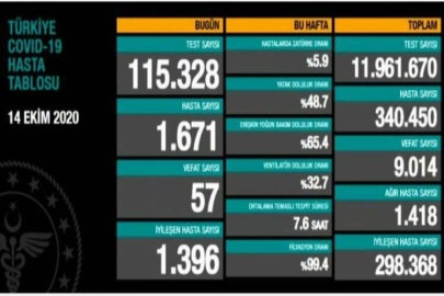 Sağlık Bakanı Fahrettin Koca 14 Ekim tarihli korona tablosunu kamuoyuyla paylaştı. Türkiye’de son 24 saatte 1.671 kişiye Covid-19 tanısı konuldu, 57 kişi hayatını kaybetti. Sağlık Bakanı Fahrettin Koca Koronavirüsün Türkiye’deki son durum bilgilerini günlük açıklıyor. Bakan Fahrettin Koca, 14 Ekim Çarşamba gününe ilişkin son durum bilgilerini paylaştı. Bakan Koca, Türkiye’de son 24 saatte 1.671 kişiye Covid-19 tanısı konulduğunu, 57 kişinin hayatını kaybettiğini açıkladı. Sağlık Bakanı Fahrettin Koca rakam ve istatistiki verileri paylaştığı açıklamasında; “Türkiye Günlük Koronavirüs Tablosu güncel verilerine göre, bugün 115 bin 328 test yapıldı. 1.671 kişiye Covid-19 tanısı konuldu. Son 24 saatte 57 hasta vefat etti, 1.396 hasta iyileşti. Toplam test sayısı 11.961.670, toplam vaka sayısı 340 bin 450, toplam vefat sayısı 9 bin 014 oldu. Hastalarda zatürre oranı %5.9, ağır hasta sayısı 1.418, iyileşen toplam hasta sayısı 298 bin 368 olarak kayıtlara geçti” dedi.