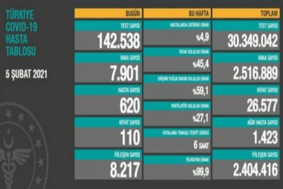 Sağlık Bakanı Fahrettin Koca 5 Şubat tarihli korona tablosunu kamuoyuyla paylaştı. Türkiye’de son 24 saatte 7.901 kişiye Covid-19 tanısı konuldu, 110 kişi hayatını kaybetti. Sağlık Bakanı Fahrettin Koca Koronavirüsün Türkiye’deki son durum bilgilerini günlük açıklıyor. Bakan Fahrettin Koca, 5 Şubat Cuma gününe ilişkin son durum bilgilerini paylaştı. Sağlık Bakanı Fahrettin Koca rakam ve istatistiki verileri paylaştığı açıklamasında; “Türkiye Günlük Koronavirüs Tablosu güncel verilerine göre, bugün 142 bin 538 test yapıldı. 7.901 pozitif vaka 620 kişi de hastane de tedavi görüyor. Son 24 saatte 110 hasta vefat etti, 8.217 hasta iyileşti. Toplam test sayısı 30.349.042, toplam vaka sayısı 2.326.256, toplam vefat sayısı 26 bin 577 oldu. Hastalarda zatürre oranı %4.3, ağır hasta sayısı 1.423, iyileşen toplam hasta sayısı 2.526.889 olarak kayıtlara geçti” dedi.