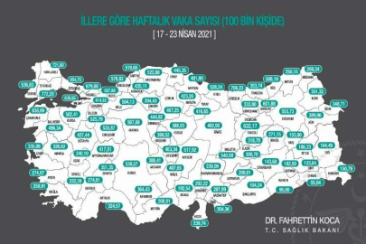 Sağlık Bakanı Fahrettin Koca sosyal medya hesabından haftalık il il vaka sayısını paylaştı. Bakan Koca yaptığı paylaşımda; “İllerimizde 100.000 nüfusa karşılık gelen haftalık vaka sayısını gösteren insidans haritamızı aşağıda görebilirsiniz. Tedbir ve kısıtlamalar etkisini daha çok gösterecek” dedi.17 - 23 Nisan koronavirüs risk haritasına göre Burdur'da her 100 binde 274,81 vaka bulunurken, Isparta'da 351,35 ve Antalya'da 324,57 olarak açıklandı. Burdur, Isparta ve Antalya’da vaka sayısındaki artış hala devam ediyor. 10 - 16 Nisan risk haritasında Burdur'da her 100 binde 258,71 vaka bulunurken, Isparta'da 367,47 ve Antalya'da 301,65 olarak açıklanmıştı. Buna göre Burdur ve Antalya'da vaka artışları hala devam ederken, Isparta'da vaka sayılarında azalma yaşanıyor.