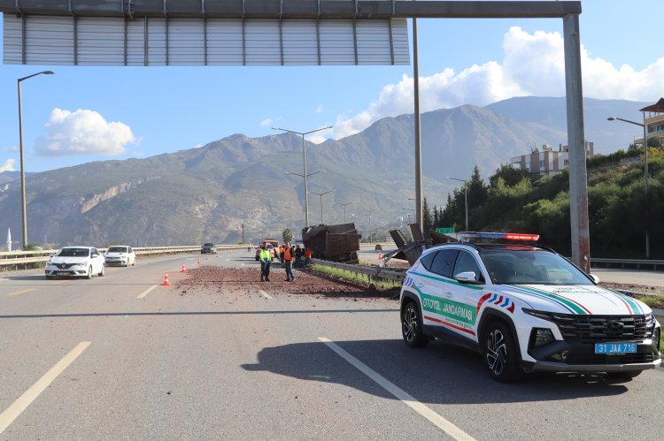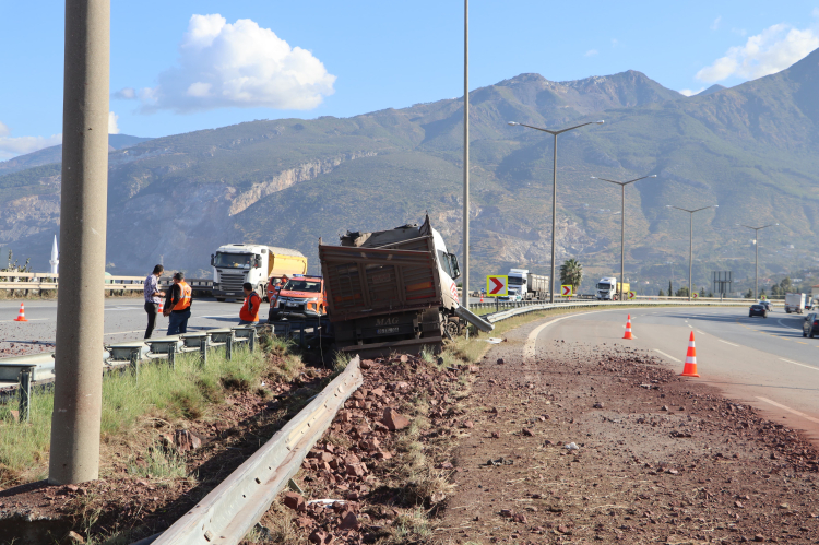 F.P'nin kullandığı 06 VPC 015 plakalı toprak yüklü tır, İskenderun-Arsuz kara yolunda sürücüsünün kontrolünden çıkıp bariyere çarptı.