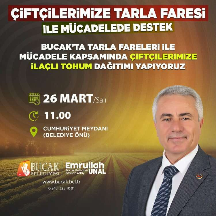 Bucak’ta tarla fareleriyle mücadele Bucak Belediye Başkanı Emrullah Ünal çiftçilere destek vereceklerini açıkladı. İşte detaylar: