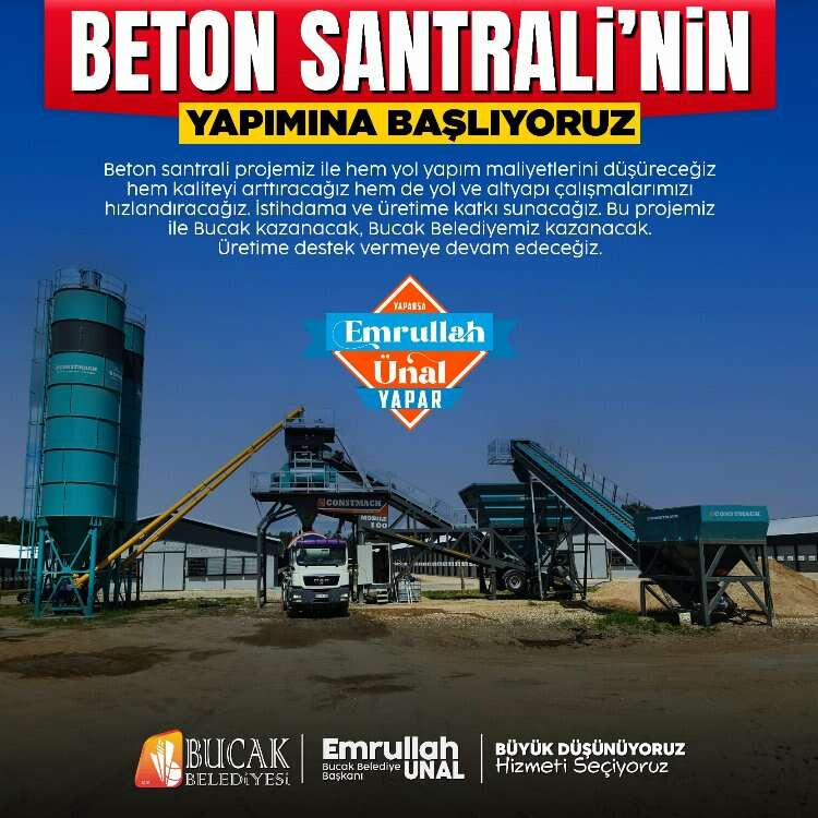 Bucak Belediye Başkanı Emrullah Ünal yaptığı açıklamada, “Geçtiğimiz yıllarda taş kırma ve eleme tesisimizi hayata geçirerek alt ve üst yapıda kullandığımız kum ve çakıl gibi malzemeleri kendimiz üretmeye başlamıştık. Artık bundan bir üste çıkarak yine aynı bölgede kendi betonumuzu kendimizin üreteceği bir mobil beton santrali kuruyoruz.