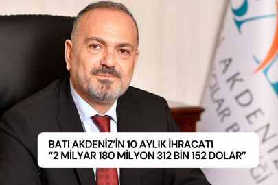 Batı Akdeniz İhracatçılar Birliği Başkanı Ümit Mirza Çavuşoğlu, yaptığı yazılı açıklamada, ekim ayında Batı Akdeniz’den ihracatın 221 Milyon 681.703 Dolar olarak gerçekleştiğini, bölgeden 1 Ocak- 31 Ekim arasında yapılan ihracatın ise 2 Milyar 180 Milyon 312.152 dolara ulaştığını belirtti.