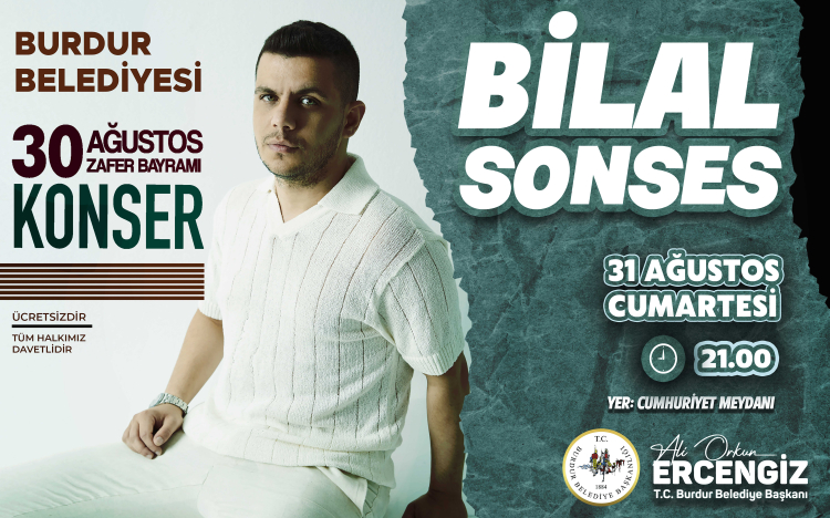 Burdur Belediyesi’nin katkılarıyla 30 Ağustos Zafer Bayramı kutlamaları kapsamında Bilal Sonses grubu sahne alacak.