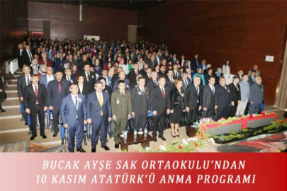 Bucak Ayşe Sak Ortaokulu tarafından Türkiye Cumhuriyeti’nin Kurucusu Yüce Önder Mustafa Kemal Atatürk’ün, vefatının 80.yıldönümü münasebetiyle program düzenlendi. Dün saat 09.30’da Bucak Kültür Merkezinde düzenlenen 10 Kasım Atatürk’ü Anma programına ilçe protokolünün yanı sıra Kurum Müdürleri, Okul Müdürleri, öğretmenler, öğrenciler ve davetliler katıldı. Saygı duruşu ve İstiklal Marşı’nın okunması ile başlayan programda günün anlam ve önemini anlatan konuşmayı yapan Ayşe Sak Ortaokulu Müdürü Ferhat Yıldırım; “10 Kasım’lar Çağdaş Türkiye’nin mimarı olan Atatürk’ün mücadelesini doğru anlamak bakımından önemlidir. Yöneticiliği ile büyük bir devlet adamı, barış ve insan severlik değerleri ile evrensel bir kişi olan Atatürk, Türk Milletinde büyük sevgi ve saygı uyandırarak dünya liderlerine örnek olmuştur” dedi. 10 Kasım Atatürk’ü Anma Günü nedeniyle ilçede düzenlenen resim, şiir kompozisyon yarışmalarında derece alan öğrencilere plaket ve hediyeleri protokol üyeleri tarafından verildi. Şiir ve kompozisyon yarışmasında 1. olan eserler okundu. Atatürk’ün hayatını, başarılarını ve kişiliğini anlatan sinevizyon izlendi. Okul öğrencileri tarafından hazırlanan oratoryo gösterisi ile program sona erdi.