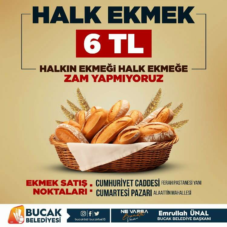 Bucak Belediye Başkanı Emrullah Ünal, “Bucak Belediyesi Halk Ekmek’te ekmeğe zam yapmıyoruz. Ekmeği 6 liradan satmaya devam edeceğiz” dedi.