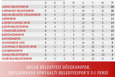 Bölgesel Amatör Lig 7. Grupta 8. Hafta maçları dün oynandı. Bucak Belediyesi Oğuzhanspor deplasmanda Konyaaltı Belediyespor ile karşılaştı. Bucak Belediyesi Oğuzhanspor karşılaşmadan3-1’lik galibiyetle ayrıldı. Saat 14.00’da Antalya Konyaaltı Atatürk Stadında oynanan maçı Hakemler Can Çakır, Sedef Aktancı, Selman Kılınç, Şevket Can Arslan yönetti. Karşılaşma sonucunda Bucak Belediyesi Oğuzhanspor, Konyaaltı Belediyespor’u 3-1 yenerek deplasmandan galip ayrıldı. Bucak Belediyesi Oğuzhanspor deplasmanda aldığı galibiyetle ligdeki puanını 14’e çıkardı.