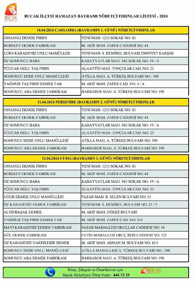 Ramazan Bayramı süresince vatandaşların ekmek ihtiyaçlarını karşılamak üzere Bucak’ta faaliyet gösteren ekmek fırınları nöbetleşe çalışacak.