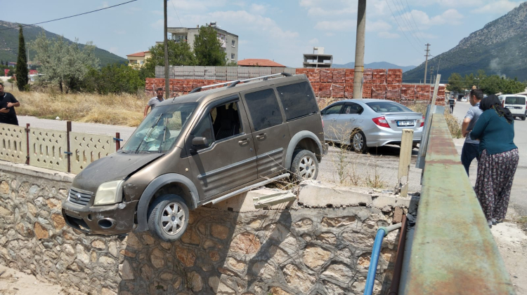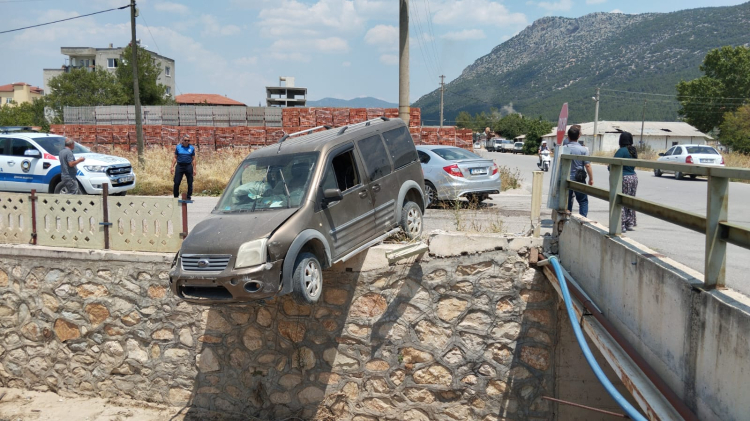Çarpışmanın etkisiyle kamyonet dere kenarında asılı kalırken otomobil direğe çarparak durabildi.