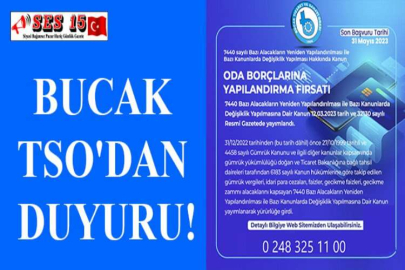 Bucak Ticaret ve Sanayi Odası tarafından yapılan açıklamayla, 31 Aralık 2022 tarihinden önce ödenmesi gerektiği halde ödenmeyen aidat borcu olan üyelerin borçlarını gecikme cezasız 30 Haziran 2023 tarihine kadar peşin olarak ödeyebileceği veya gecikme cezasız 9 taksitte ödemek üzere yapılandırabileceği kamuoyuyla paylaşıldı. Bucak TSO'dan yapılan açıklama şöyle;