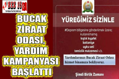 Bucak Ziraat Odası Başkanlığı deprem bölgesine gönderilmek üzere yardım toplama kampanyası başlattı. Konuyla ilgili Odadan yapılan açıklamada; “Bucak Ziraat Odası Başkanlığı olarak deprem bölgesine gönderilmek üzere görselde de belirtilen temel ihtiyaçlar için tüm halkımızdan yardım bekliyoruz. Yardım etmek isteyenler yardımını hizmet binamıza getirmelerini önemle rica ediyoruz” denildi.